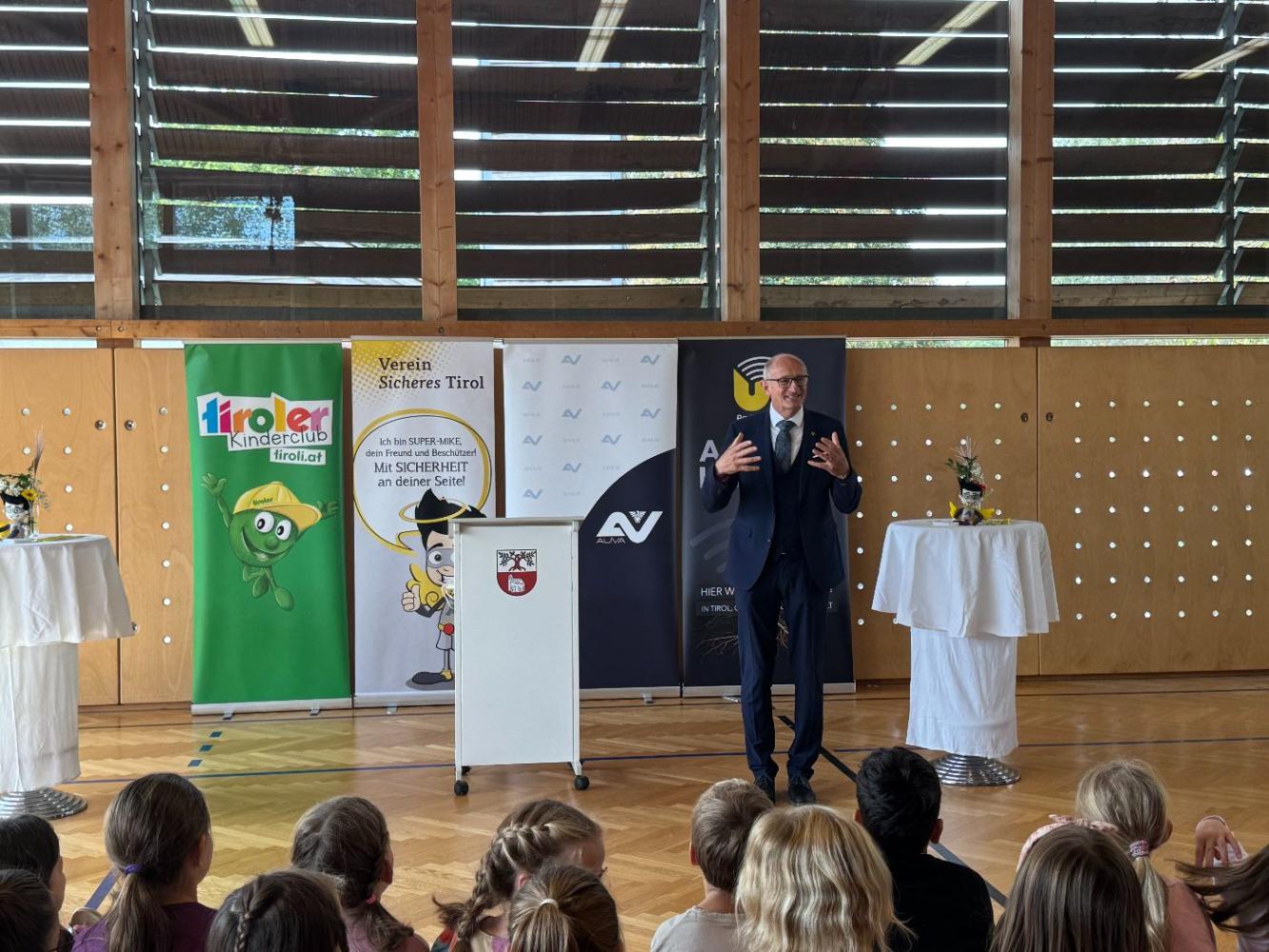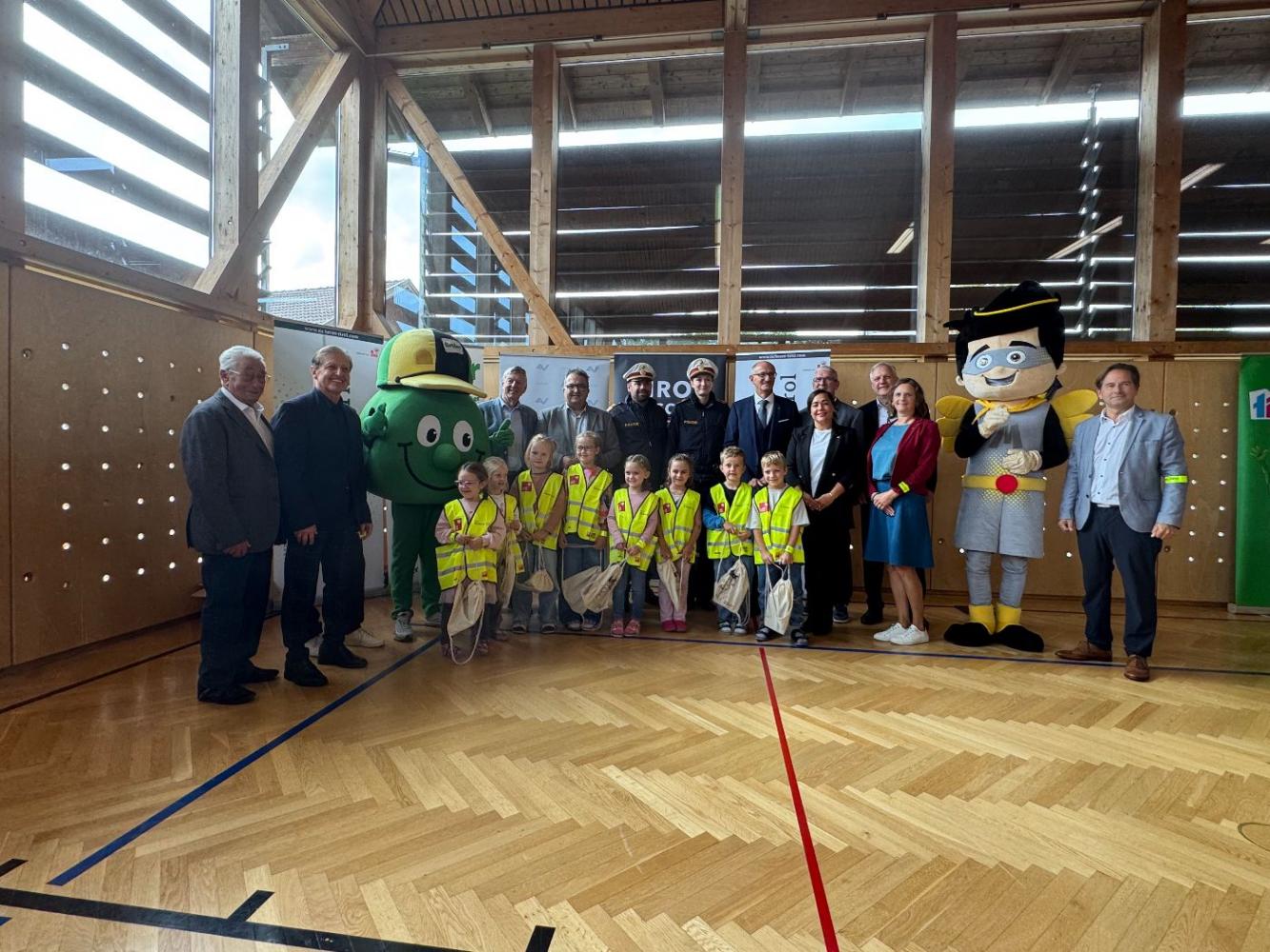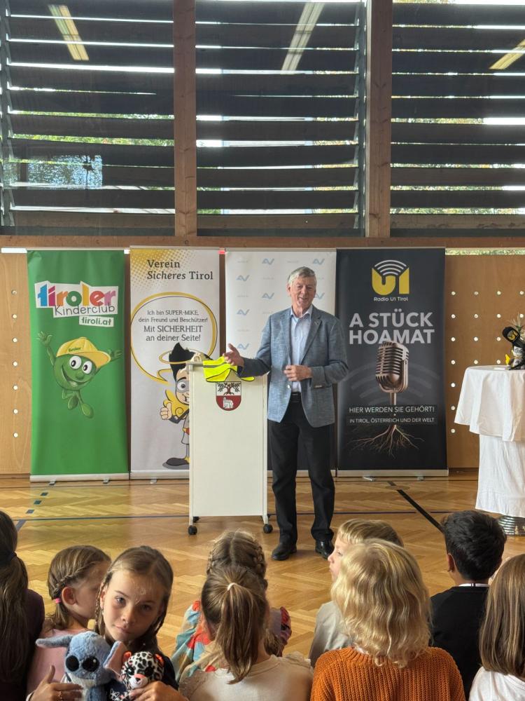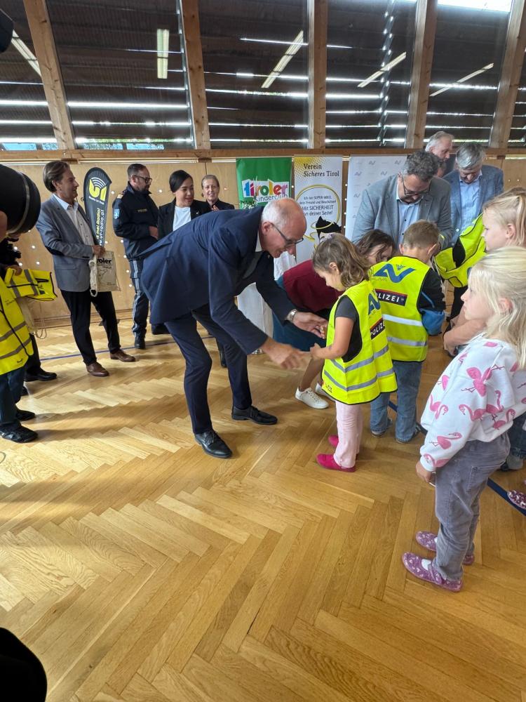 Am Freitag, 26. September 2025, gab es in unserem Turnsaal die offizielle Übergabe des Schulstartpakets 2025. Dazu werden an Volksschülerinnen und Volksschüler reflektierende Sicherheitswesten sowie altersgerechte Verkehrsbroschüren verteilt. Zu diesem besonderen Anlass waren neben dem Landeshauptmann Anton Mattle auch wichtige Vertreter zahlreicher Kooperationspartner und Sponsoren dieser Aktion geladen. Die gesamte Schule durfte alle anwesenden Gäste mit einem Lied begrüßen. Nach einigen Ansprachen rund um das Thema "Sicherheit am Schulweg" bekamen unsere acht Erstklässler*innen das Schulstartpaket überreicht.