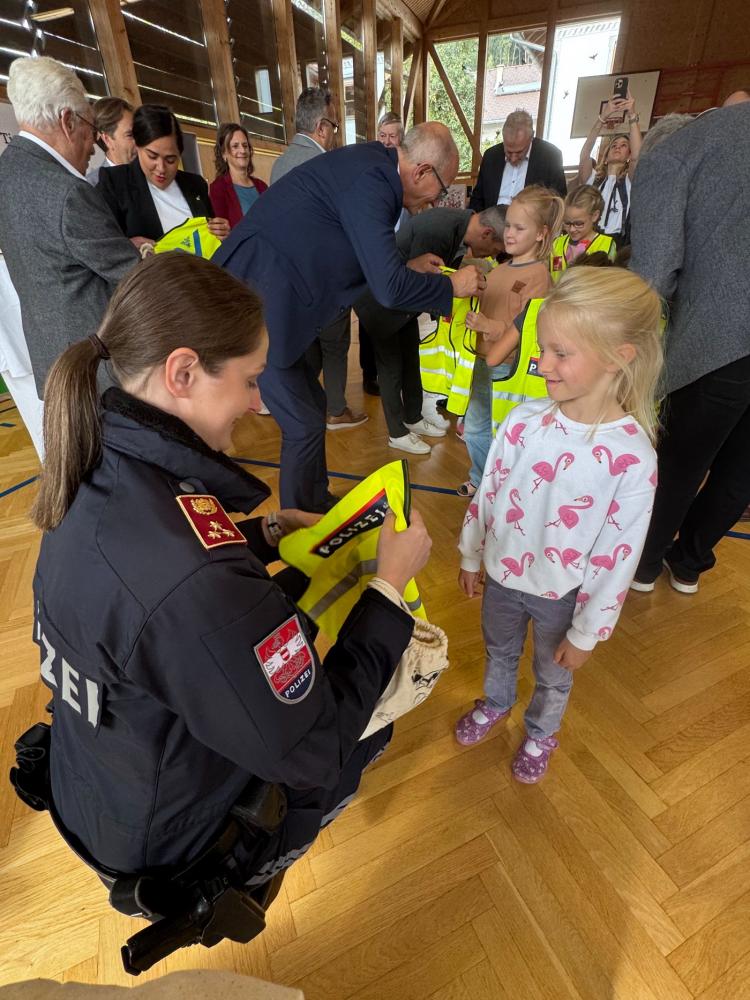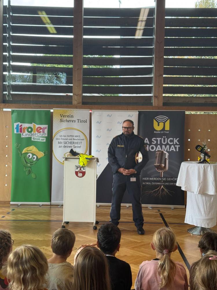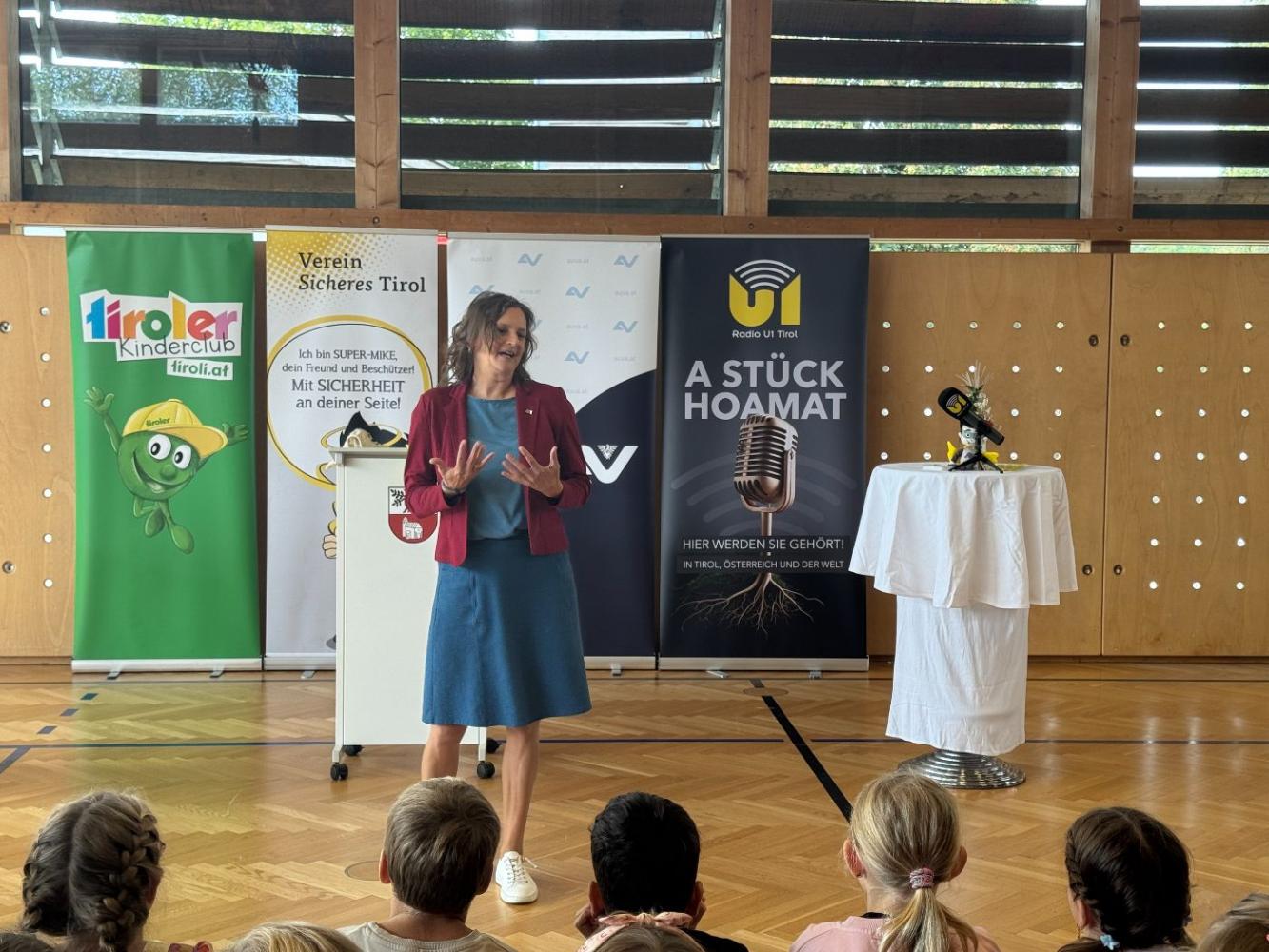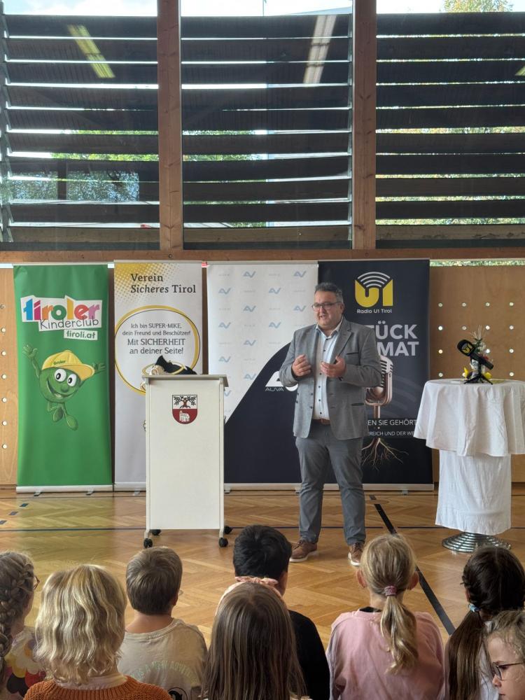 Am Freitag, 26. September 2025, gab es in unserem Turnsaal die offizielle Übergabe des Schulstartpakets 2025. Dazu werden an Volksschülerinnen und Volksschüler reflektierende Sicherheitswesten sowie altersgerechte Verkehrsbroschüren verteilt. Zu diesem besonderen Anlass waren neben dem Landeshauptmann Anton Mattle auch wichtige Vertreter zahlreicher Kooperationspartner und Sponsoren dieser Aktion geladen. Die gesamte Schule durfte alle anwesenden Gäste mit einem Lied begrüßen. Nach einigen Ansprachen rund um das Thema "Sicherheit am Schulweg" bekamen unsere acht Erstklässler*innen das Schulstartpaket überreicht.
